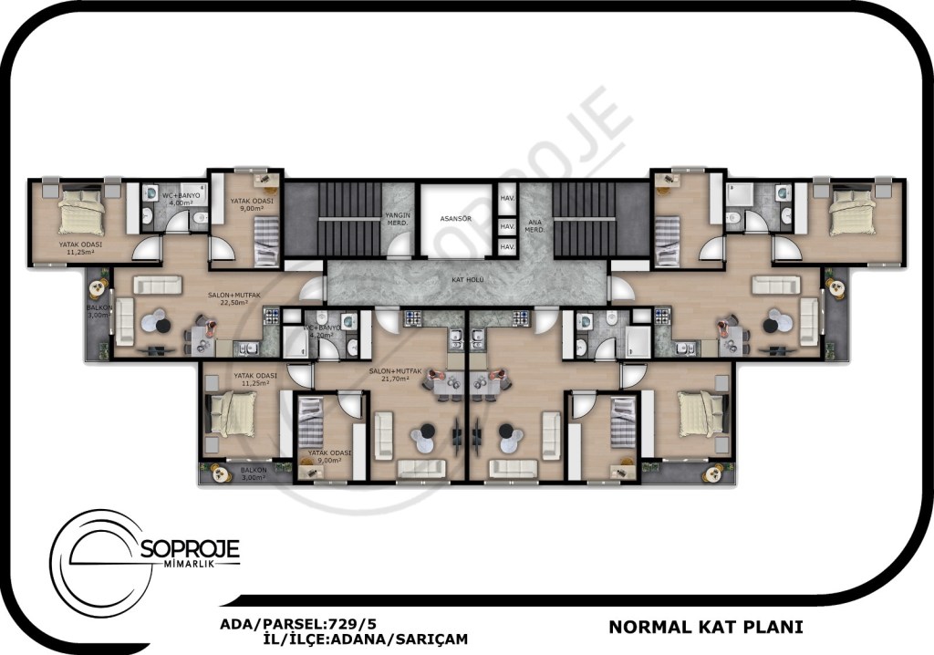 Proje 2+1 açık mutfak şeklinde planlandı.34 adet daireden oluşan projenin 2 dairesi zeminde kat bahçeli olarak planlanmış , apartman da bahçeli ev konforu yaşatmakta. Kalan tüm daireler güney cepheli ve tüm gün güneşi alacak , yaşam konforu düşünülerek planlanmıştır. Proje bölgesine tüm topluma taşıma araçları ile ulaşım mevcut olmakla beraber, stadyum ve üniversitelere araç ile 10 dakika , lise , ilköğretim sağlık ocağı, cami ve marketlere ise yürüyerek bir kaç dakika mesafede olan projemiz 2024 yılı içerisinde sahiplerine teslim edilecektir.